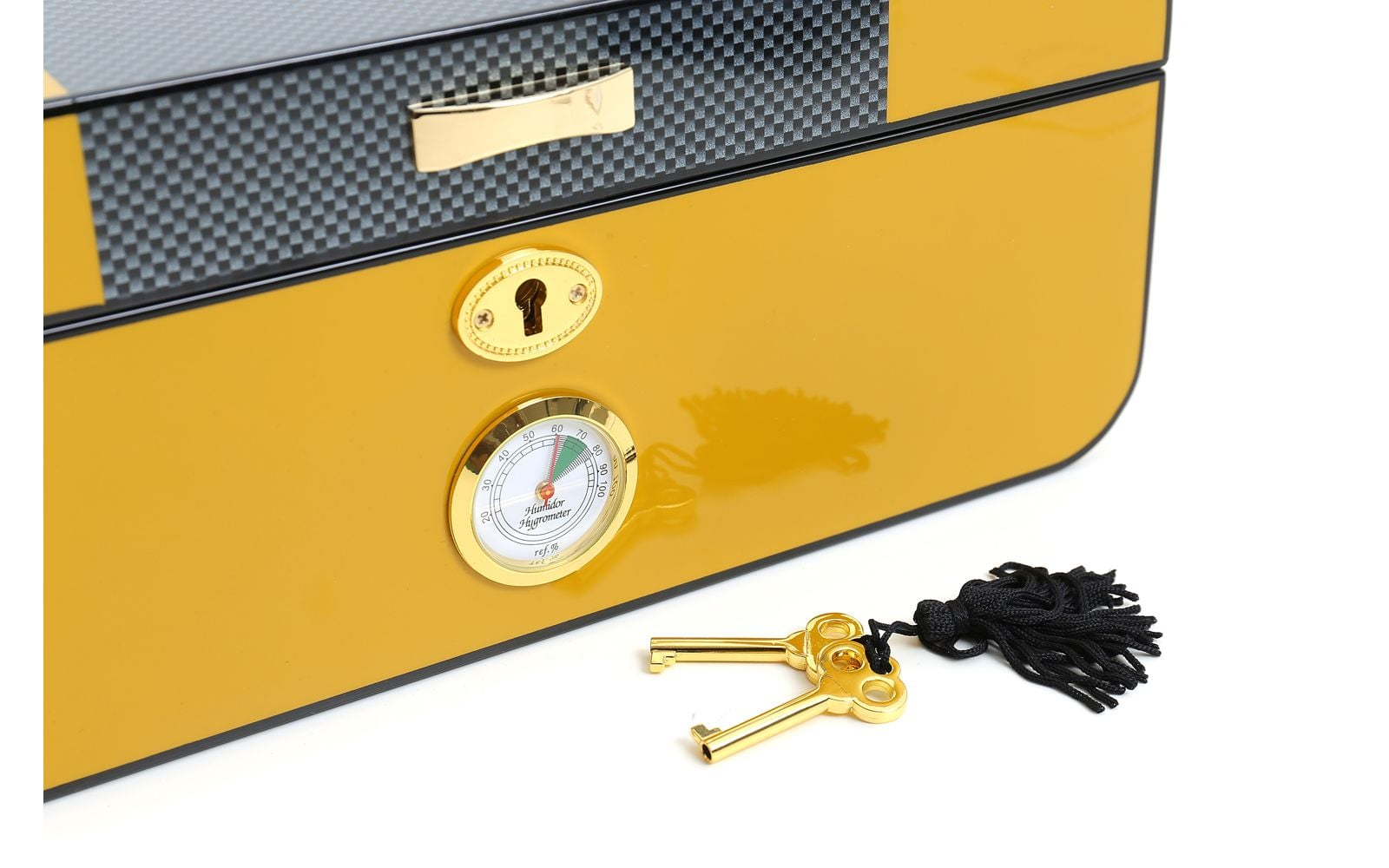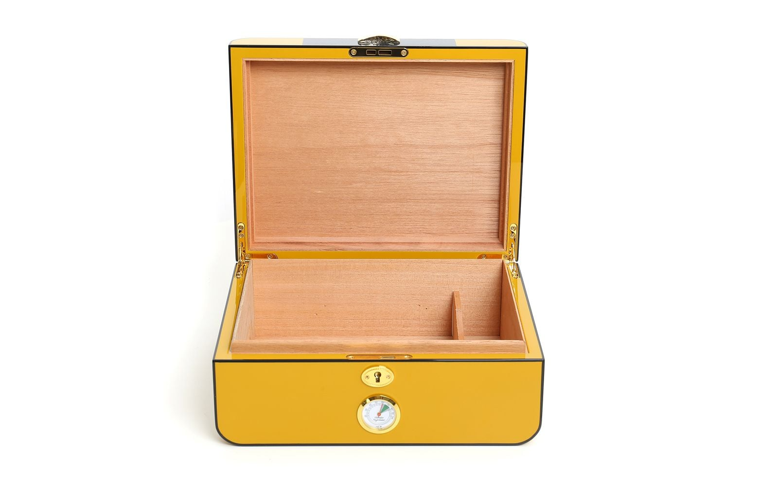 Our Savinelli Yellow lacquered carbon-fibre humidor with gold-coloured internal hinges is perfect for preserving the aroma of your fine, premium cigars.