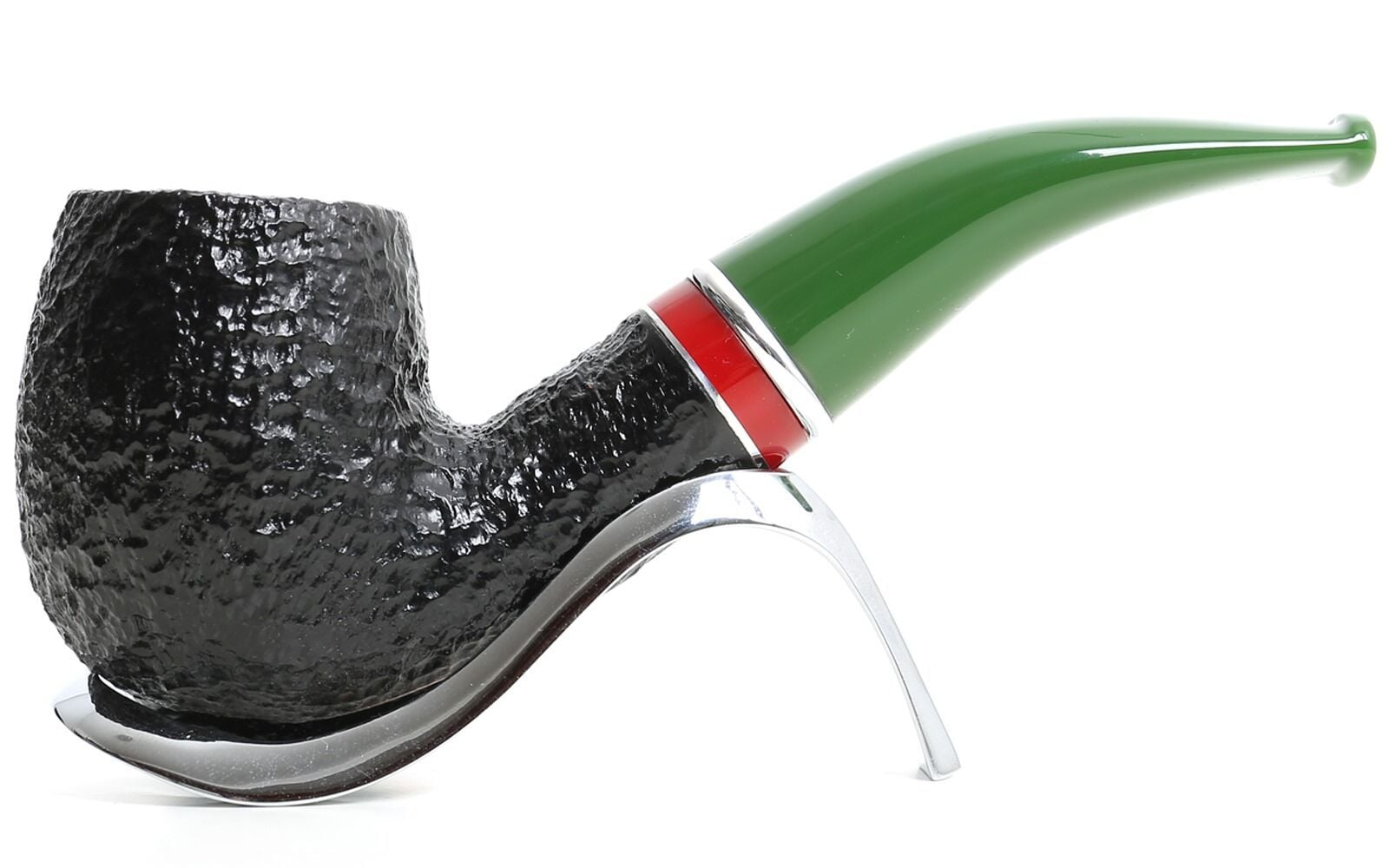 The design is embellished with a red acrylic band and a thinner aluminum ring. Green acrylic stem with a silver-colored ring that perfectly matches the pipe.