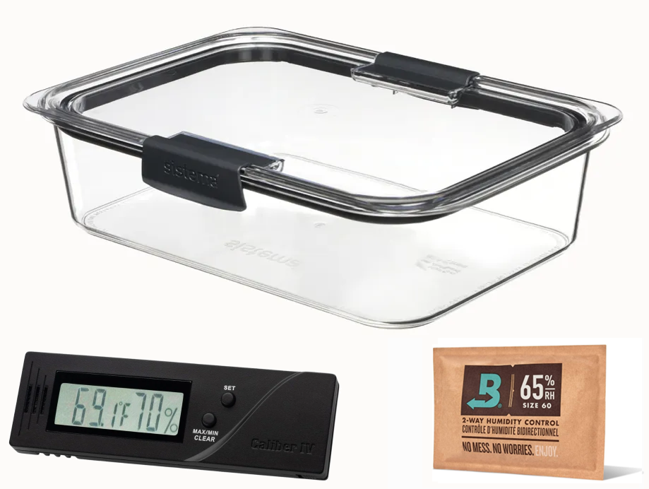 This Large size Tupperdor can hold upto 20 Toro' sized cigars as well as a Single Boveda SIZE-60 humidity pack and a Cigar Oasis Caliber V Digital Hygrometer and sheet of Spanish cedar.
